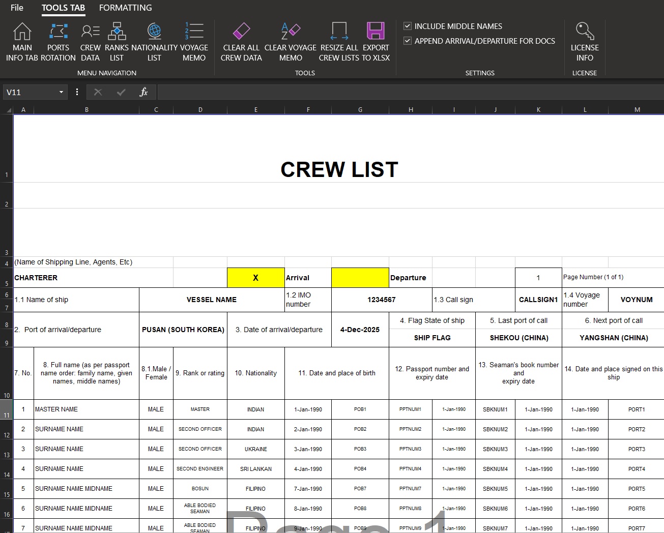 - Crew List Arrival / Departure (based on extended IMO crew list — includes full personal details, ranks, passport and seaman book, and joining info)