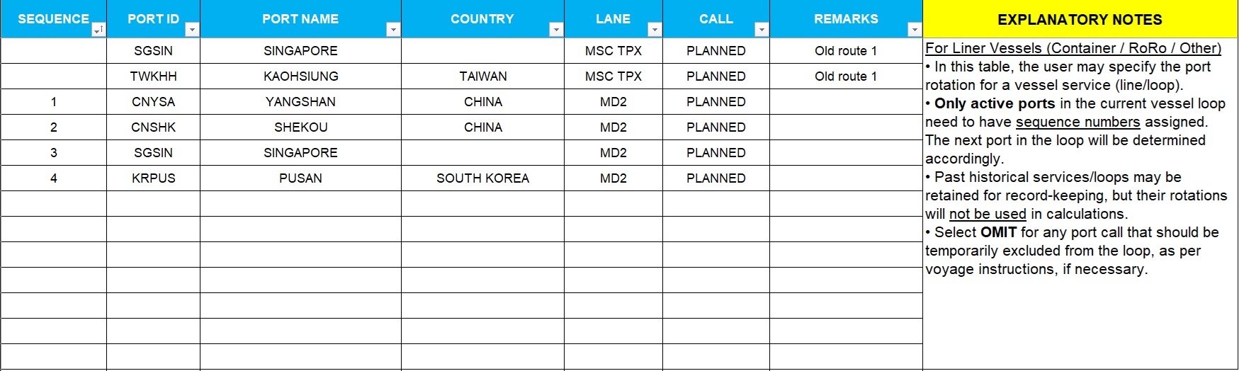 PortFormKit includes a built-in voyage memo system that helps you manage port rotations and call sequences with full flexibility — ideal for container ships and liner services.